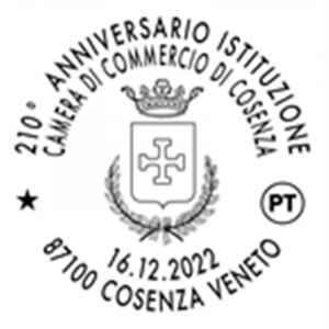 Poste Italiane ha attivato per venerdì 16 dicembre, un servizio filatelico temporaneo con bollo speciale con la dicitura: “210° anniversario Istituzione Camera di Commercio di Cosenza – 16.12.2022 – 87100 Cosenza Veneto”.