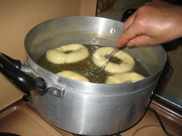 Una volta lievitato, l’impasto ottenuto viene diviso in diverse porzioni, alle quali viene data la classica forma di ciambella.