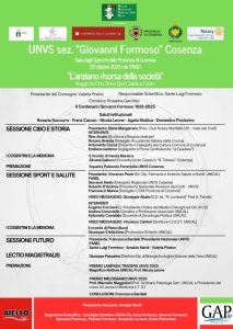 L’evento rappresenta anche un omaggio sentito a Giovanni Formoso, veterano dello sport e promotore instancabile di valori educativi e civici. A cento anni dalla sua nascita, la sezione UNVS a lui intitolata rinnova il suo impegno nel custodire e diffondere il suo lascito, attraverso iniziative che uniscono sport, cultura e solidarietà. Diverse le sessioni organizzate. Da quella sul cibo e la storia con Elena Mangiarano (Pres. Club Rotary Montalto Uff.- Valle del Crati) e gli interventi di Rino Amato (Scrittore e Regista teatrale), Rosario Branda (Delegato Accademia Italiana della Cucina), Antonietta Cozza (Docente e Delegata alla Cultura Comune di Cosenza) Emiliano lantorno (Ingegnere e Priore Confraternita “la Quadara”). Passando per “i cosentini e la memoria” con il ricordo di Vanda Marsico da parte di Silvana Gallucci (Docente Liceo Classico “B. Telesio” Cosenza).