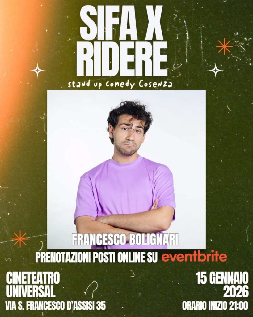 Prosegue “SIFA X RIDERE“, la prima rassegna di stand-up comedy nel cuore del centro storico di Cosenza, nata dall’idea di Elisa Pizzini e Paolo Pasqua, insieme a Marley Session, Gynestra e Cineteatro Universal.