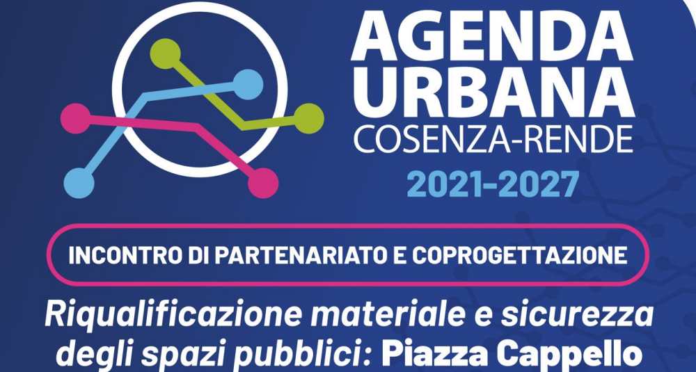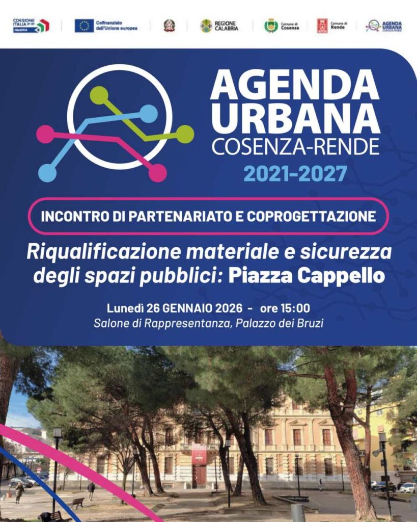 E’ in programma lunedì prossimo, 26 gennaio, alle ore 15,00, nel salone di rappresentanza di Palazzo dei Bruzi, il primo incontro di partenariato e coprogettazione della nuova Agenda Urbana Cosenza-Rende 2021-2027. Tema dell’incontro è la “Riqualificazione materiale e sicurezza degli spazi pubblici, con particolare riferimento a Piazza Cappello”.