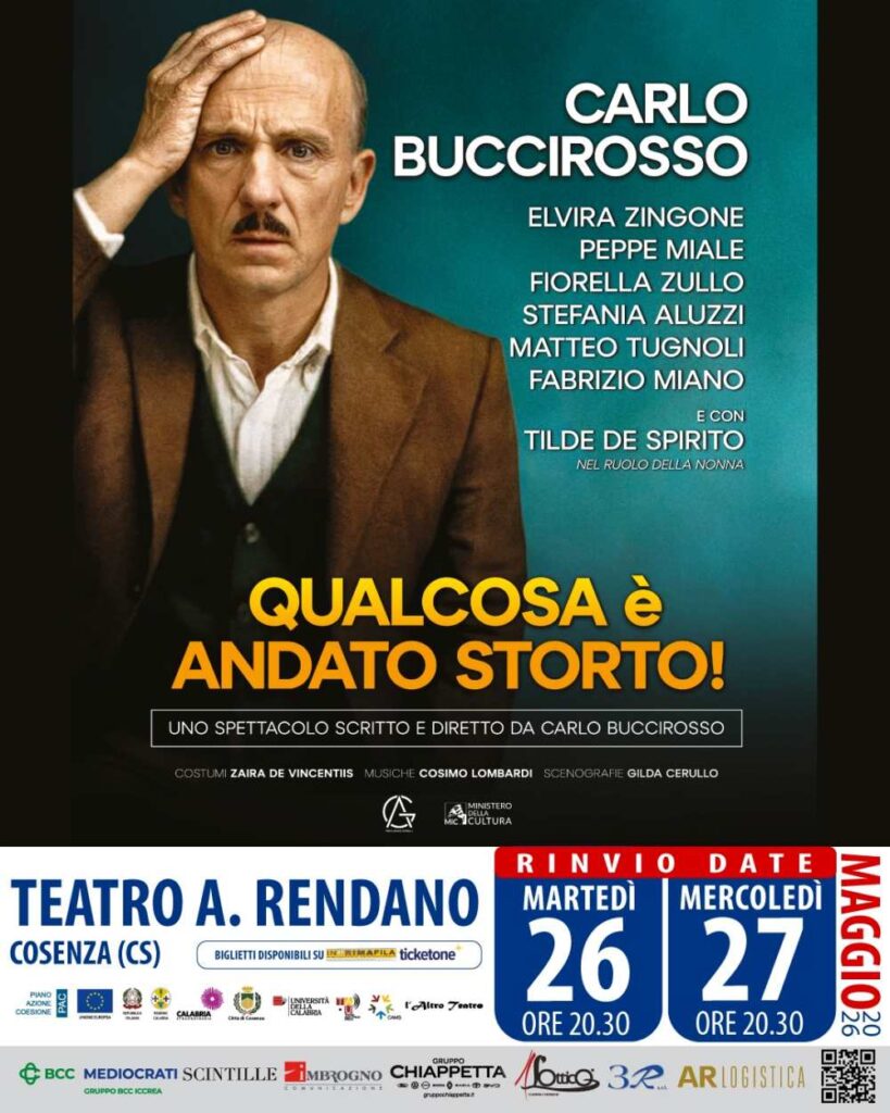 Lo spettacolo “Qualcosa è andato storto” in programma questa sera, venerdì 24 aprile e sabato 25 aprile, al Teatro A. Rendano di Cosenza nell’ambito della Rassegna L’Altro Teatro, è stato rinviato a causa di un sopraggiunto problema di salute di uno dei protagonisti. La commedia scritta e diretta da Carlo Buccirosso si terrà martedì 26 maggio 2026, alle ore 20.30, e mercoledì 27 maggio, alle ore 20.30. Insieme a Buccirosso salirà sul palco un affiatato cast composto da Elvira Zingone, Peppe Miale, Fiorella Zullo, Stefania Aluzzi, Matteo Tugnoli, Fabrizio Miano e Tilde De Spirito.