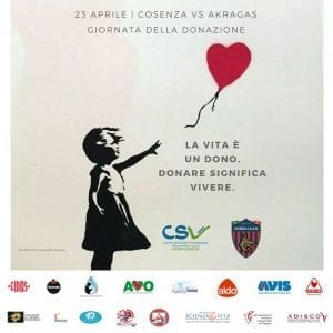Nuovo appuntamento con le iniziative che stanno accompagnando i match casalinghi del Cosenza Calcio. La società bruzia ospiterà in tribuna B domenica oltre 700 volontari di associazioni che si occupano di donazione degli organi, del sangue, del midollo osseo e del latte materno di tutta la provincia. Saranno allestiti per l’occasione degli stand negli spazi antistanti allo stadio per sensibilizzare i tifosi alla cultura della donazione. Nessun ex nelle due squadre. Arbitrerà l’incontro Luigi Carella di Bari, che verrà assistito da Giuseppe Antonacci di Barletta e Sante Selicato di Siena. Il fischietto pugliese dirigerà per la prima volta in questa stagione sia l’una che l’altra compagine.