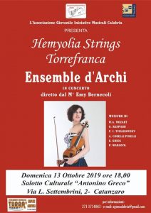 Altra importante iniziativa musicale organizzata dall’Associazione Giovanile Iniziative Musicali Calabria, presieduta dall’avvocato Raffaele Silipo, che si terrà domenica 13 ottobre alle ore 18,00 presso il Salotto Culturale “Antonino Greco” sito in via Luigi Settembrini 2 di Catanzaro. In concerto ci sarà infatti l’Ensemble d’Archi “Hemyolia Strings Torrefranca”, diretto dal M° Emy Bernecoli.