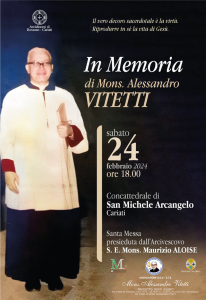 È in programma per sabato 24 febbraio 2024 alle 18 una santa messa in memoria del Servo di Dio, mons. Alessandro Vitetti, scomparso il 24 febbraio 1995. La funzione si terrà nella Concattedrale di San Michele Arcangelo a Cariati; a presiedere la celebrazione eucaristica sarà Mons. Maurizio Aloise, Arcivescovo della Diocesi di Rossano-Cariati.