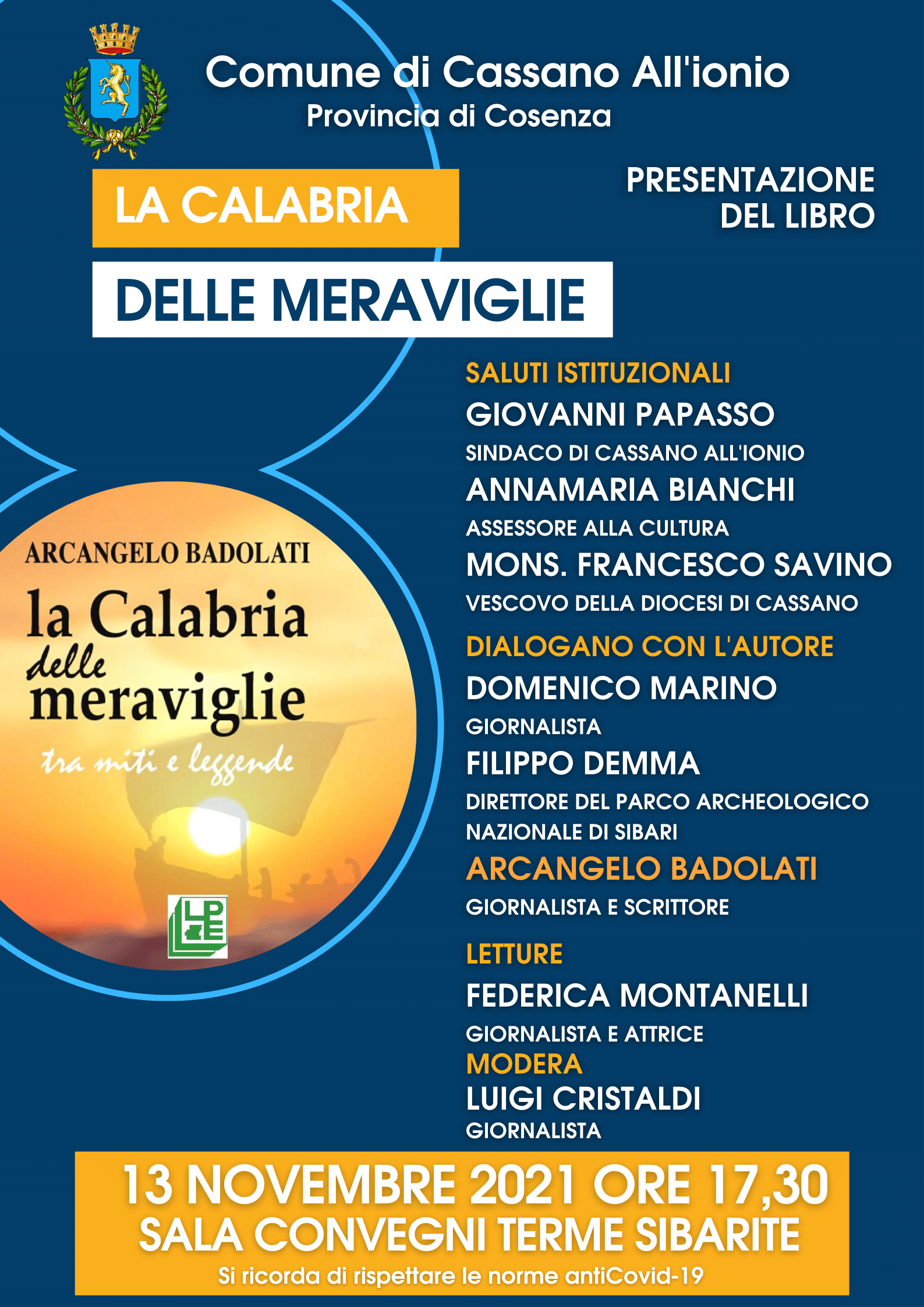 L’evento si terrà sabato 13 novembre alle ore 17,30 nella sala convegni delle Terme Sibarite. I saluti istituzionali saranno affidati al Sindaco Giovanni Papasso, all’Assessore alla Cultura Annamaria Bianchi e al Vescovo della Diocesi di Cassano, Monsignor Francesco Savino.