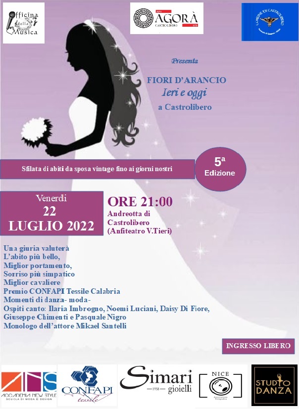 La quinta edizione di “Fiori d’arancio ieri e oggi a Castrolibero” riapre i battenti dopo due anni di fermo causa covid, sarà presentato venerdì 22 Luglio alle ore 21:00 presso l’anfiteatro V.Tieri di Castrolibero e vedrà protagonisti abiti da sposa vintage fino ai giorni nostri, indossati da ragazze, mamme e mogli accompagnate da gentili cavalieri.