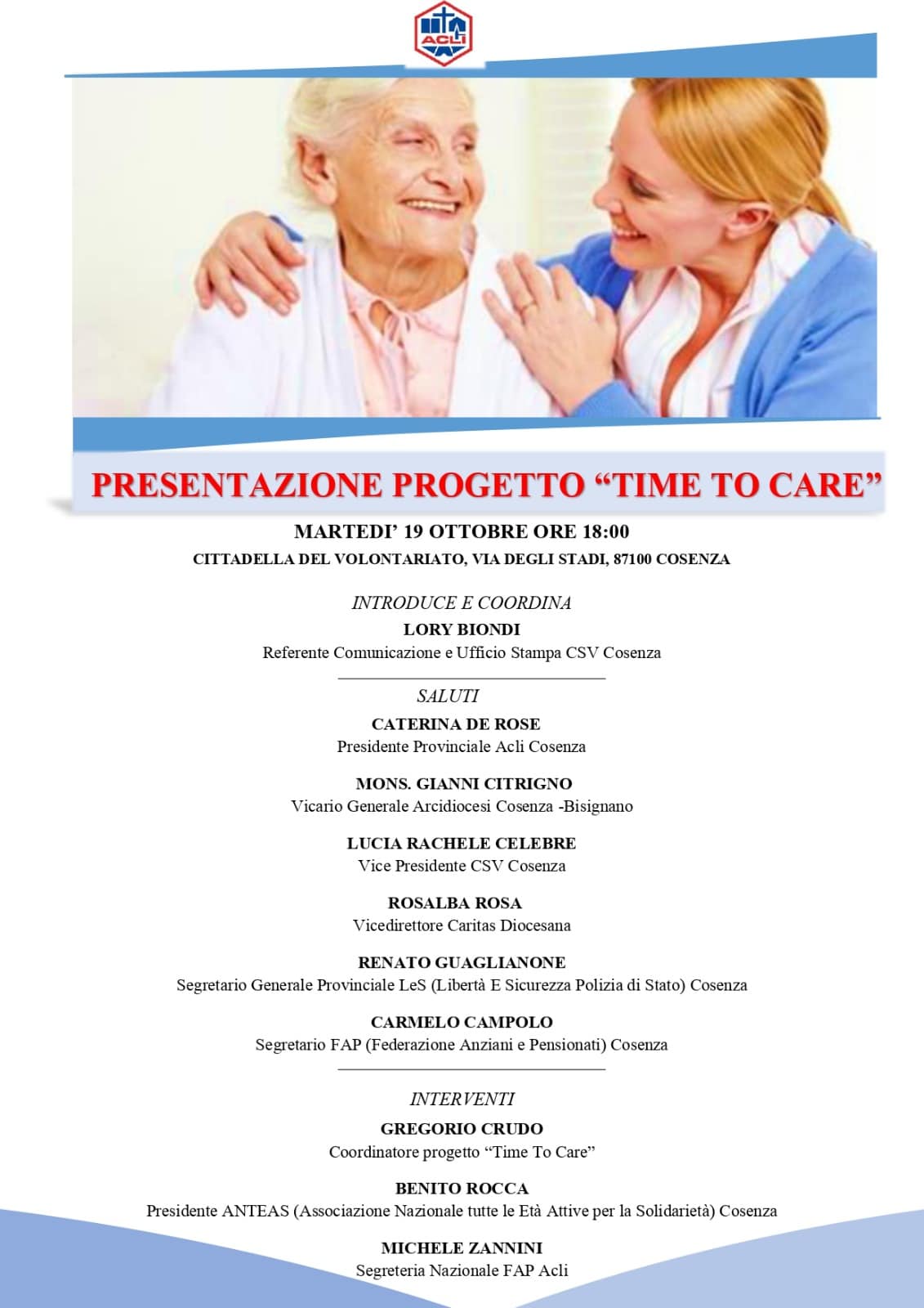 Cosenza, 15 ottobre 2021 – 2mila anziani non saranno più soli grazie al progetto promosso da ACLI (Associazioni Cristiane Lavoratori Italiani), sede provinciale di Cosenza, nell’ambito del bando “Time to care” emanato dal dipartimento per le politiche giovanili e dal dipartimento per le politiche per la famiglia. Giovani under 35 offriranno supporto e assistenza alle persone in età avanzata attraverso attività di welfare leggero. Quali il disbrigo di piccole faccende (consegna della spesa, acquisto di farmaci, pagamento di bollette, consegne a domicilio di diversi beni).