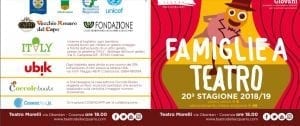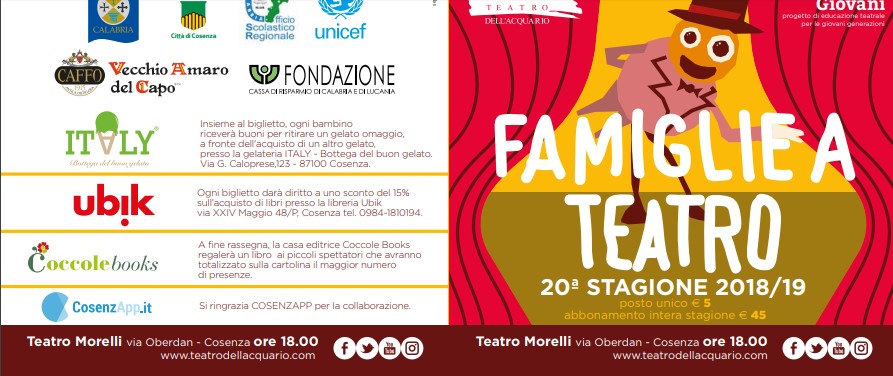Domenica 11 Novembre 2018, alle ore 18.00, presso il Teatro Morelli di Cosenza, prende il via la rassegna FAMIGLIE A TEATRO, organizzata dal Centro R.A.T/Teatro dell’Acquario e che quest’anno giunge alla ventesima edizione. In cartellone 11 spettacoli di compagnie provenienti da tutta Italia, che porteranno in scena il meglio della produzione di teatro per ragazzi.