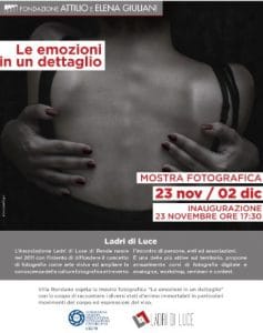 A Cosenza, nella splendida cornice di Villa Rendano, prende avvio, con inaugurazione sabato 23 novembre, dalle 17:30 la mostra collettiva 2019 dell’Associazione Culturale Fotografica Ladri di Luce: “Le emozioni in un dettaglio”.