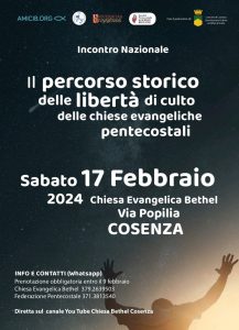 Sabato 17 febbraio 2024 sarà una giornata molto importante per la città di Cosenza, ma anche per il mondo delle Chiese evangeliche pentecostali italiane, si terrà un incontro nazionale su: Il percorso storico delle libertà di culto delle chiese evangeliche pentecostali, con la partecipazione di numerosi pastori, provenienti da varie parti d’Italia, fedeli evangelici che afferiscono a comunità calabresi e anche studenti dell’Università degli studi della Calabria.