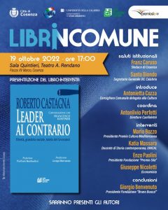 Riprende, dopo la pausa estiva, la rassegna libraria “Libri in Comune”, promossa dal Sindaco Franz Caruso e dall’Amministrazione comunale, con l’obiettivo di rilanciare le attività culturali in città attraverso una sempre maggiore diffusione della cultura del libro e della lettura, coinvolgendo i luoghi culturali per eccellenza, come il Teatro “Rendano”, il Museo dei Brettii e degli Enotri, il complesso monumentale di San Domenico e lo stesso Palazzo municipale. Curatrice della rassegna è la consigliera delegata del Sindaco alla Cultura, Antonietta Cozza, che per il primo appuntamento di questo nuovo ciclo di incontri, che nella prima fase ha raccolto molti apprezzamenti, in termini di partecipazione, ha proposto la presentazione del volume “Leader al contrario”, libro-intervista scritto da Roberto Castagna, storico dirigente della UIL calabrese, insieme con il giornalista Francesco Kostner e pubblicato per i tipi della Luigi Pellegrini Editore.