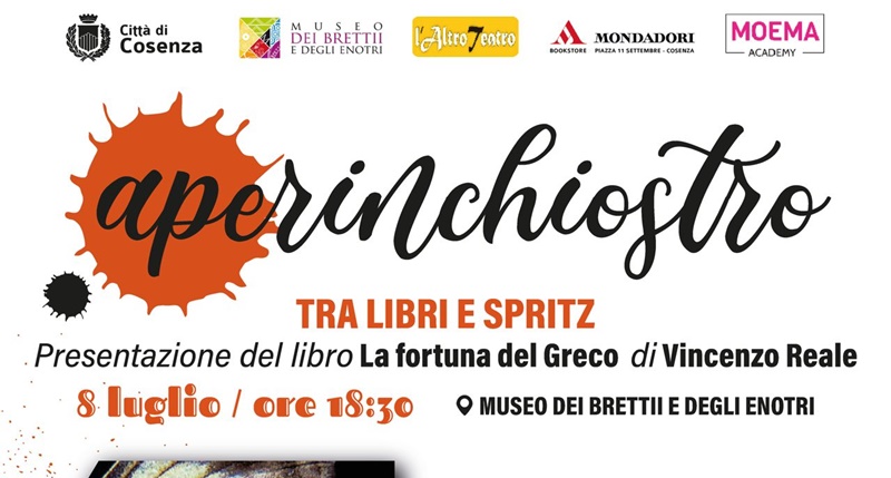 Secondo appuntamento, lunedì 8 luglio, alle ore 18,30, al Museo dei Brettii e degli Enotri, con “Aperinchiostro”, la rassegna libraria promossa dall’Amministrazione comunale guidata dal Sindaco Franz Caruso e ideata dalla consigliera delegata alla Cultura Antonietta Cozza, e che mescola, in una felice commistione, l’aperitivo della sera, il luogo – il suggestivo chiostro della struttura museale – l’inchiostro dei libri e la musica come indovinatissimo corollario. Per questa seconda occasione della nuova edizione della manifestazione, la terza in ordine di tempo, è in programma la presentazione del libro di Vincenzo Reale “La fortuna del Greco”, edito da Rubbettino. Il libro è finalista al Premio Flaiano ed è il romanzo di esordio di Vincenzo Reale. Il programma della presentazione di lunedì 8 luglio prevede i saluti istituzionali del Sindaco Franz Caruso. Con l’autore dialogherà lo scrittore Antonio Pagliuso. La presentazione sarà moderata dal critico letterario Antonella Falco alla quale, quest’anno, l’ideatrice della rassegna, Antonietta Cozza, ha affidato il coordinamento artistico di “Aperinchiostro”.