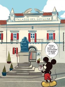 Dichiara il Collettivo Macondo, protagonista del progetto di residenze: “La richiesta che abbiamo ricevuto era di produrre delle illustrazioni che potessero in qualche modo unire il mondo di Topolino al patrimonio culturale di Cosenza. La residenza è servita soprattutto per l’ispirazione e la condivisione, stimolati da quello che abbiamo visto e scoperto. Infatti, per quanto, prima ancora della residenza, avessimo discusso e parlato più volte di quello che avremmo potuto fare per la mostra, le idee che abbiamo sviluppato non sarebbero mai arrivate senza aver visitato le varie location. Come ad esempio quella di completare i bozzetti di Boccioni esposti a Palazzo Arnone con Topolino, oppure usare le decorazioni presenti sui muri di Villa Rendano e ridisegnarli con Topolino, o ancora, pensare ai personaggi del mondo Disney con gli abiti tipici dei Brettii e degli Enotri. Dopo la residenza, ecco che inizia la parte più divertente: agosto e settembre lo abbiamo dedicato alla realizzazione delle tavole. Ora le opere sono giunte a Cosenza, esposte nei musei della città, ed è emozionante che i prodotti delle nostre idee si trovino proprio lì, lì dove è nata l’ispirazione”.