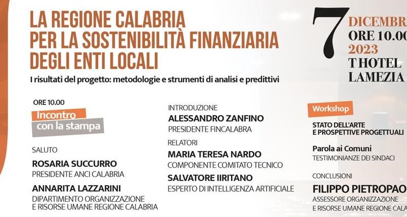 Giovedì 7 dicembre, alle ore 10, presso il T- Hotel di Lamezia, si terrà l’appuntamento “La Regione Calabria per la sostenibilità finanziaria degli enti locali”