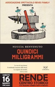 Quindici Milligrammi è il titolo del libro di Nuccia Benvenuto, edito da “L’Erudita”, che verrà presentato sabato 16 Marzo presso il Centro Storico di Rende ( Sezione Combattenti e Reduci), alle ore 18.00.