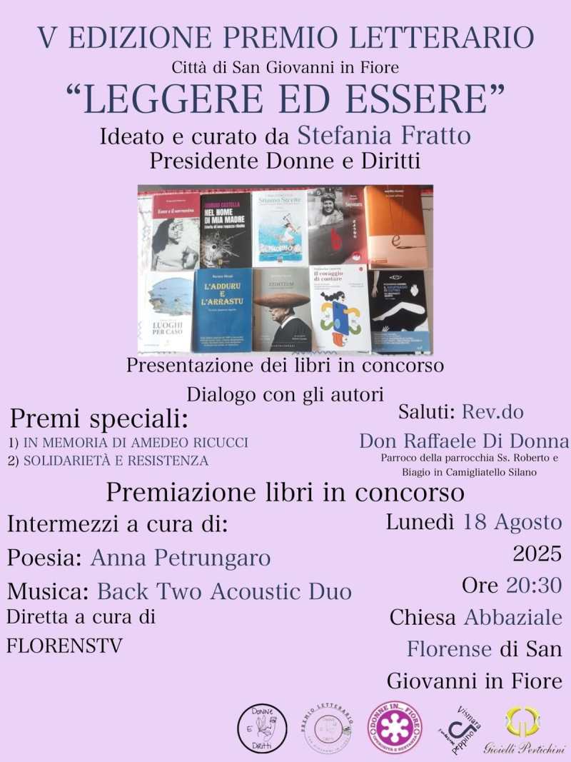 L’associazione Donne e Diritti è lieta di annunciare la V edizione del premio letterario “Città di San Giovanni in Fiore, Leggere ed Essere”, ideato e curato da Stefania Fratto, presidente dell’associazione. L’evento si terrà il 18 agosto 2025 presso la Chiesa Abbaziale a San Giovanni in Fiore, con inizio alle ore 20:30.