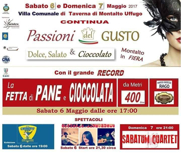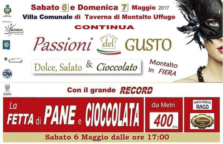E’ un week-end di passioni del gusto quello che si prospetta in questo fine settimana a Taverna di Montalto Uffugo presso la villa comunale Canonaco con stand gastronomici, spettacoli e il record della fetta di pane e cioccolata più lunga al mondo