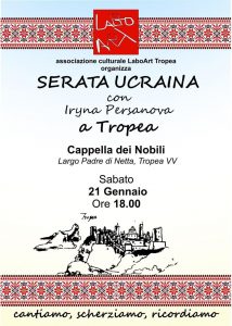 CULTURA E SOLIDARIETÀ – SABATO 21 SERATA UCRAINA. Arte e solidarietà. Promossa dall’associazione culturale LaboArt Tropea la Serata Ucraina vedrà la partecipazione dell’artista Iryna Persanova, ex solista dell’Opera Nazionale Ucraina. Il concerto teatrale sarà ospitato sabato 21 alle ore 18 nella cappella dei Nobili, in Largo Padre di Netta.