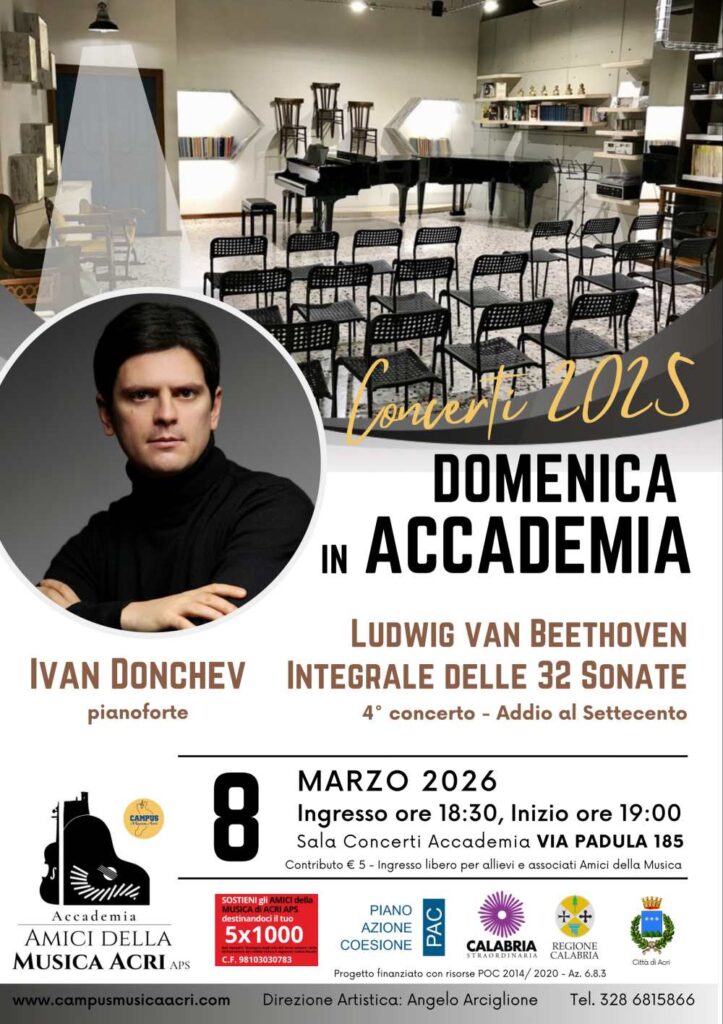 Prosegue all’Accademia Amici della Musica di Acri il grande progetto dedicato all’esecuzione integrale delle 32 Sonate per pianoforte di Ludwig van Beethoven, affidato al pianista bulgaro Ivan Donchev, tra i pochi interpreti oggi in Italia ad affrontare dal vivo e a memoria l’intero corpus beethoveniano.