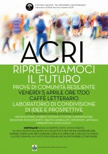 “Acri, riprendiamoci il futuro: prove di comunità resiliente”, è il claim dell’incontro che si terrà il 5 aprile, alle 17, nello spazio del Caffè Letterario di Palazzo Sanseverino. Oltre ad essere uno slogan dall’impatto accattivante e coinvolgente, il vero spirito dell’incontro è un’esortazione diretta a quanti non vogliono subire il corso delle cose, e non ci stanno a rimanere dentro il corto circuito tipico del nostro sud, “fulminato” spesso da sbalzi di rassegnazione e disinteresse.