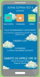 L’appuntamento, anteprima dell’Aghia Sophia fest che si terrà il 24 e 25 maggio a Cosenza, vedrà protagonista il traduttore italiano (per i tipi di Einaudi) Armando Canzonieri, dell’ultima fatica letteraria del filosofo coreano, di stanza a Berlino, Byung-Chul Han, intitolato “La crisi della narrazione”. A seguire, il concerto del regista, videomaker e musicista Mauro Nigro, con il suo progetto Cassidy. L’area food&drink sarà curata dall’attigua Salumeria Occhiuto. L’ingresso all’evento è gratuito.