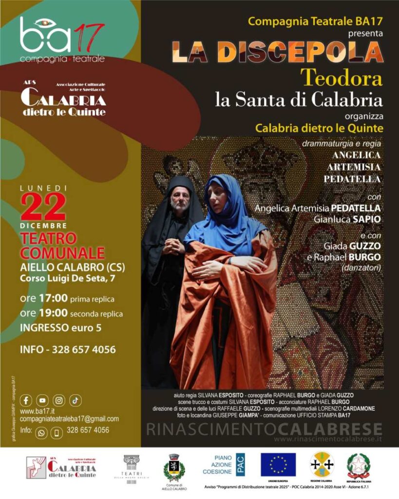 “LA DISCEPOLA. TEODORA LA SANTA DI CALABRIA” ha attraversato le città tra il nord ed il sud della Calabria, in un anno di vita ha silenziosamente attraversato il cuore del pubblico che ha richiesto di conoscere la storia di questa singolare donna del Medioevo che scelse la via dello Spirito per vivere fino in fondo la sua vita. L’opera, scritta e diretta da Angelica Artemisia Pedatella, porta in scena il mistero di un mondo bizantino che oggi più che mai va scoperto e conosciuto.