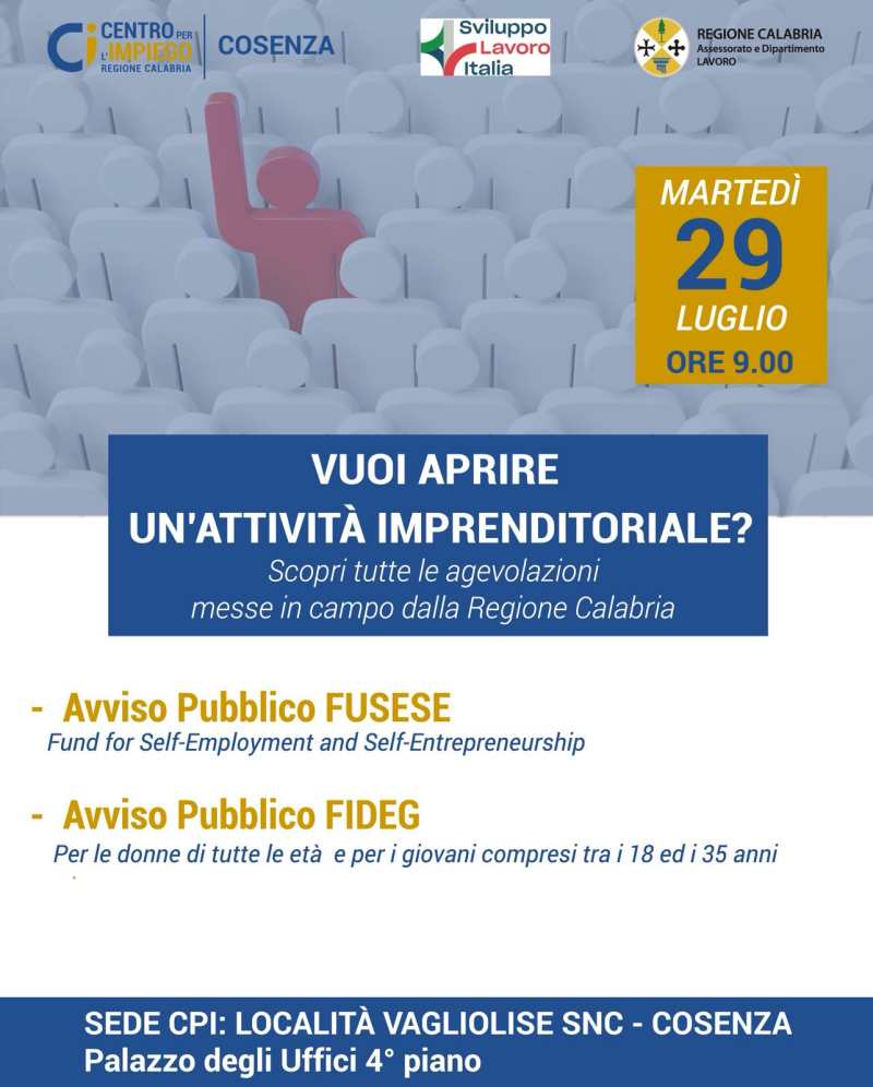 L’occasione è stata fertile per fornire a chi ha un’idea imprenditoriale da realizzare, informazioni, chiarimenti e una prima assistenza sulle tipologie di incentivi e le agevolazioni introdotte dalla Regione Calabria e su come richiederle, ma anche per mettere in luce la presenza di un servizio che il Centro per l’Impiego offre già in maniera consolidata.