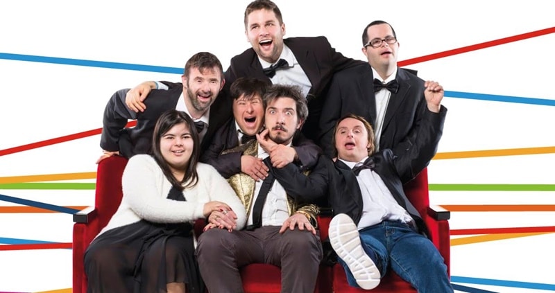 Paolo Ruffini è in scena con gli attori disabili della Compagnia Mayor Von Frinzius di Livorno (cinque di loro con Sindrome di Down, uno affetto da autismo e uno in carrozzina).