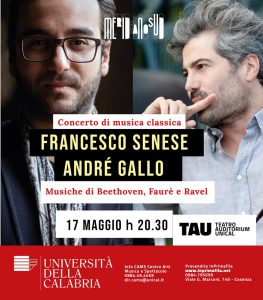 Prosegue il cartellone di “Meridiano Sud”: la nuova stagione teatrale del Teatro Auditorium Unical che il 17 maggio, alle ore 20:30, ospiterà l’atteso concerto di musica classica del Duo Gallo-Senese, formato dal pianista André Gallo e dal violinista Francesco Senese