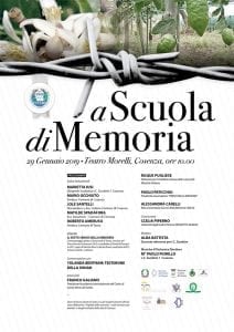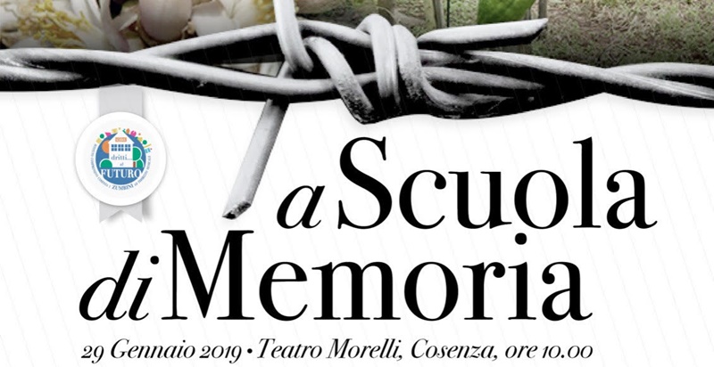 “A SCUOLA DI MEMORIA” è il titolo della giornata di riflessione, ricca di testimonianze e conversazioni per diffondere la conoscenza della Shoah, in programma martedì 29 gennaio, alle ore 10,00, al Teatro “Morelli” di Cosenza. E’ un’iniziativa della scuola media “Zumbini”, sostenuta dalla Rete Universitaria per il Giorno della Memoria, in collaborazione con Comune di Cosenza, Comune di Tarsia e con il patrocinio della Camera dei Deputati, dell’Unione delle Comunità Ebraiche Italiane e di Napoli Ebraica.