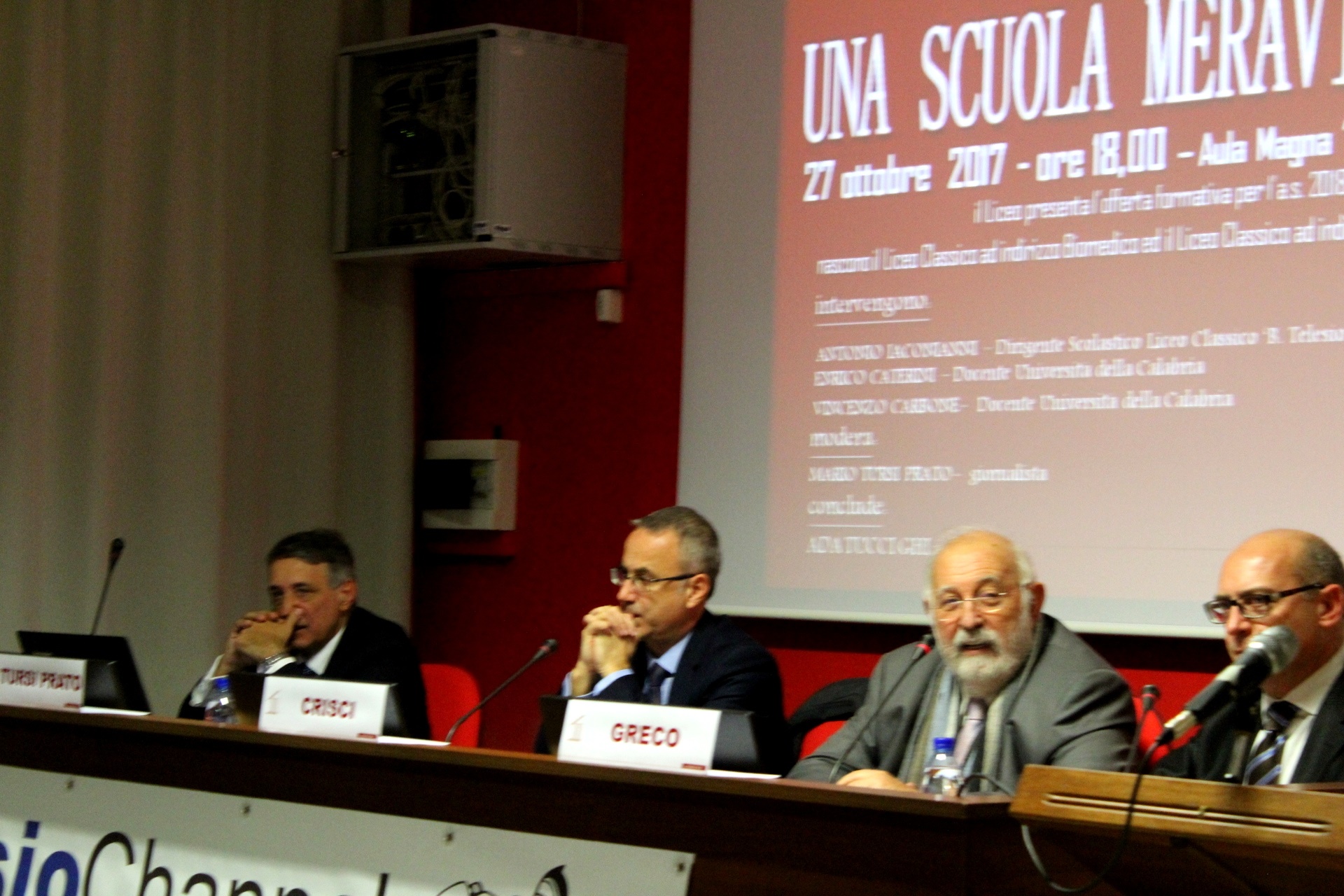Sono intervenuti il magnifico rettore dell’Università della Calabria, Gino Mirocle Crisci, il dirigente provinciale del MIUR Cosenza, Luciano Greco, il Dirigente Scolastico del Liceo ‘Telesio’, Antonio Iaconianni ed i docenti dell’UNICAL, Enrico Caterini e Vincenzo Carbone. I lavori sono stati conclusi da Ada Tucci Ghi, già docente di latino e greco del Liceo ‘Telesio’. Ha moderato l’incontro il giornalista Mario Tursi Prato.