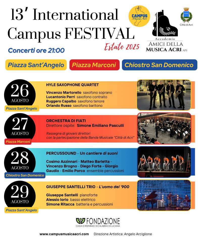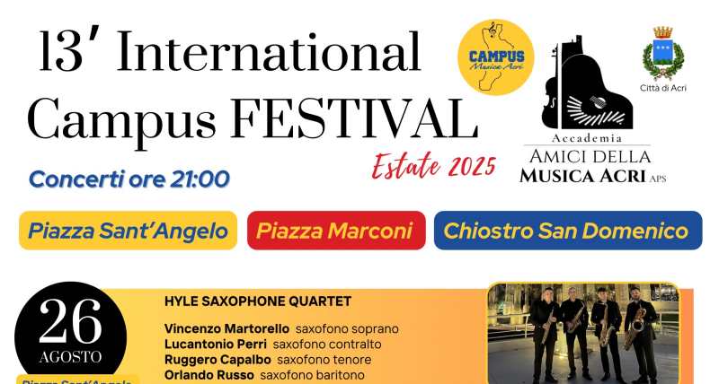 Torna ad Acri uno degli appuntamenti più attesi dell’estate musicale calabrese: dal 26 al 29 agosto 2025 si tiene la 13ª edizione estiva dell’International Campus Festival, organizzato dall’Accademia Amici della Musica di Acri APS, sotto la direzione artistica del M° Angelo Arciglione. Il festival, patrocinato dal Comune di Acri e sostenuto dalla Fondazione Cassa di Risparmio di Calabria e di Lucania, si conferma come una vetrina di eccellenza per giovani talenti e artisti affermati, offrendo al pubblico quattro serate di musica di altissimo livello in suggestive location della città.