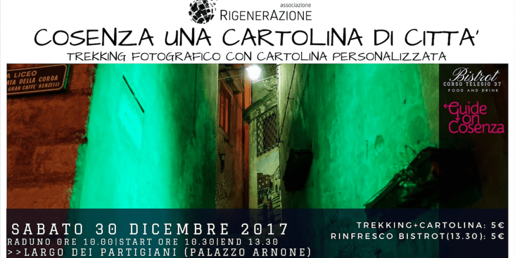 Parte il primo di una serie di appuntamenti organizzati dall’associazione culturale RigenerAzione, che opera con le sue attività di promozione turistica e valorizzazione del centro storico di Cosenza. Il 30 dicembre avrà luogo “Cosenza, una cartolina di Città”, percorso di trekking fotografico alla scoperta del centro storico, assistiti da una guida turistica di “Guide on Cosenza” e da un giornalista appassionato del centro storico del blog “Esplorazioni cosentine”.