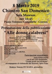 Sarà presentato venerdì otto marzo alle 16,45, nella sala Museum del chiostro di San Domenico, il volume “Alle donne calabresi” a cura dell’area VII, ufficio Promozione e Divulgazione della Soprintendenza Abap per le province di Catanzaro, Cosenza e Crotone.