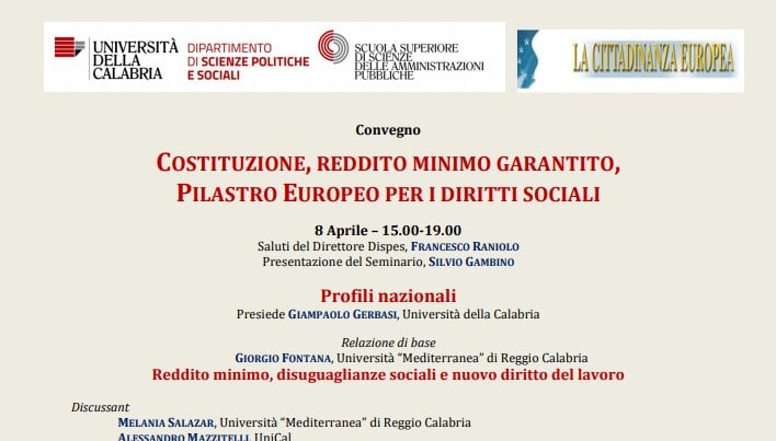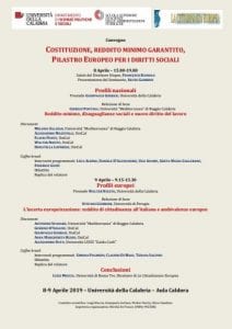 Dopo vari anni di discussione pubblica, e dopo alcuni mesi di discussione politica, è in corso di pubblicazione sulla Gazzetta Ufficiale la legge di conversione del Decreto legge sul cd. “Reddito di cittadinanza”. Per consentire una libera discussione accademica che possa inquadrare e verificare il contesto in cui questa riforma sociale si inserisce, nella prossima settimana, in data 8-9 Aprile 2019, presso l’Aula Caldora dell’Università della Calabria, si terrà il Convegno dal titolo “Costituzione, Reddito minimo garantito, Pilastro Europeo per i Diritti Sociali”.