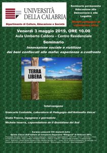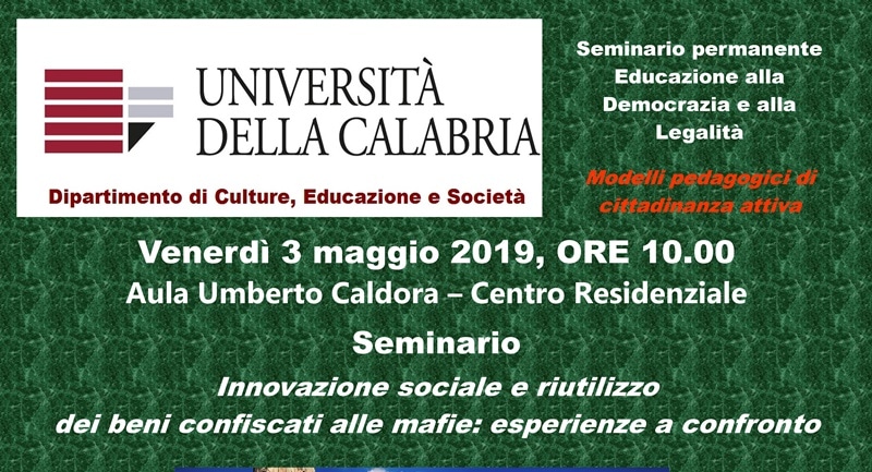 “Innovazione sociale e riutilizzo dei beni confiscati alle mafie: esperienze a confronto” è il tema del seminario promosso dal Laboratorio di Pedagogia dell’Antimafia del Dipartimento di Culture, Educazione e Società, che si terrà il prossimo venerdì 3 maggio alle ore 10:00 presso l’Aula Umberto Caldora dell’Università della Calabria.