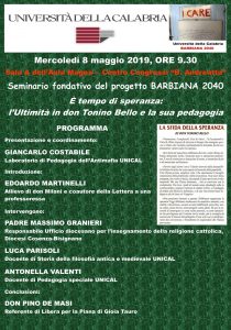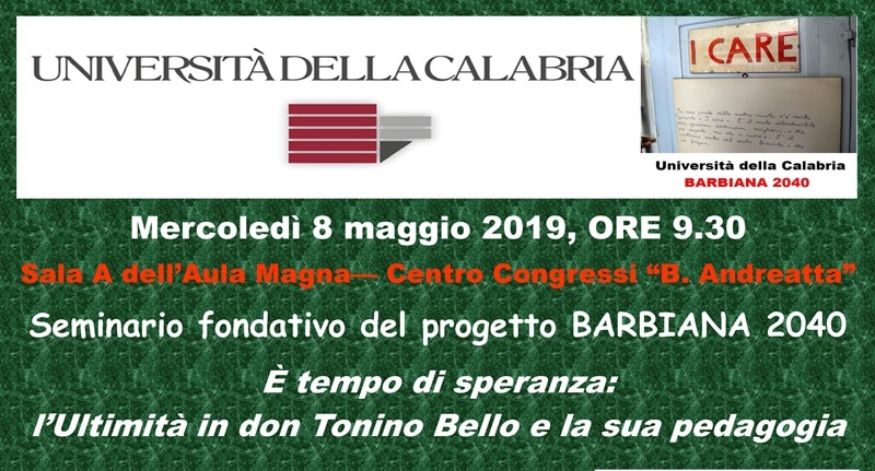 Si terrà mercoledì 8 maggio alle ore 9.30 presso la Sala A dell’Aula Magna dell’Università della Calabria, il seminario fondativo del progetto Barbiana 2040, per una Pedagogia degli Ultimi. L’iniziativa, nel giorno in cui venne ritrovato il corpo di Peppino Impastato, è dedicata nello specifico al concetto di Ultimità in don Tonino Bello, sacerdote e vescovo impegnato nella costruzione di una pedagogia dell’inclusione sociale.