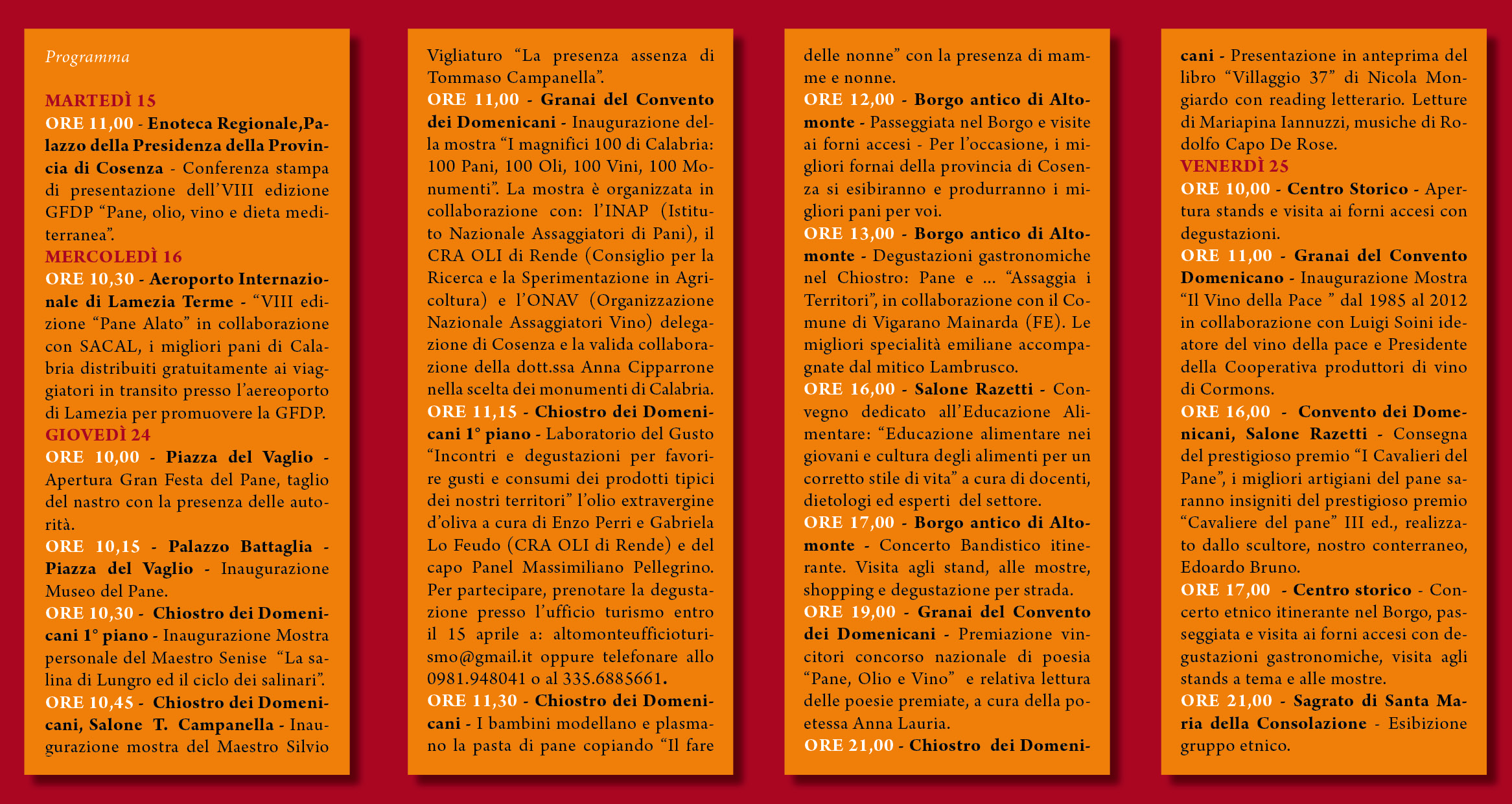 In più sono in programma due convegni tematici, uno dedicato all’educazione alimentare per un corretto stile di vita a cura di docenti dietologi ed esperti del settore che si terrà oggi, 24 aprile, alle ore 16.00 presso il Salone Razetti del convento domenicano. L’altro ha come tema “La dieta mediterranea-ill buon mangiare allunga la vita” in collaborazione con l’UNICAL e la Fondazione Paolo Di Tarso che si terrà sabato 26 aprile alle ore 11.00 presso il salone Razetti del convento domenicano. Non solo, perché parallelamente verrà inaugurata la mostra “I Magnifici 100 di Calabria”, con 100 pani, 100 oli, 100 vini, 100 monumenti organizzata in collaborazione con INAP (Istituto Nazionale Assaggiatori di Pani), CRA OLI di Rende (Consiglio per la Ricerca e la Sperimentazione in Agricoltura) e l’ONAV (Organizzazione Nazionale di Assaggiatori Vino) delegazione di Cosenza presso i Granai del Convento dei domenicani che si terrà il 24 aprile alle ore 11.00. Da ricordare anche, il 26 aprile alle ore 20.30 presso l’Hotel Barbieri, la Cena della Solidarietà, a favore della ricerca in collaborazione con la LILT (Lega italiana per la lotta contro i tumori) sezione provinciale di Cosenza.