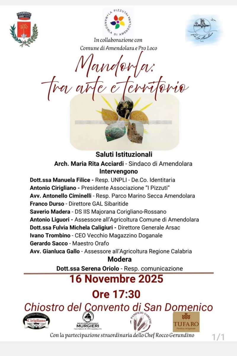 “Mandorla: tra arte e territorio”, questo il tema della convention che avrà luogo domenica 16 novembre a partire dalle ore 17:30 nel Chiostro del Convento di San Domenico nel rione Timpone ad Amendolara centro.