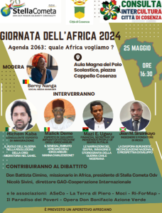 Ad organizzare l’evento, denominato “Giornata dell’Africa 2024, Agenda 2063, quale Africa vogliamo?”, l’associazione Stella Cometa Odv e la Consulta Intercultura della Città di Cosenza. L’intento è dare voce alle persone provenienti da questo continente che lavorano o studiano nelle nostre città. Nel quadro di sviluppo socioeconomico del Continente, promosso dall’Agenda 2063, vi è il raggiungimento di un’Africa stabile e sicura attraverso un rafforzamento dell’attività di prevenzione e gestione dei conflitti.