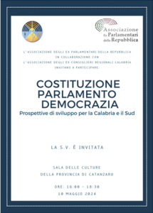 L’Associazione Ex Parlamentari della Repubblica Italiana, in collaborazione con l’Associazione Ex Consiglieri della Regione Calabria, terrà l’iniziativa che è itinerante su tutto il territorio italiano e che farà tappa a Catanzaro il prossimo 10 maggio 2024, alle ore 16, presso la Sala delle Culture della Provincia di Catanzaro: “COSTITUZIONE, PARLAMENTO, DEMOCRAZIA. Prospettive di sviluppo per la Calabria e il Sud”