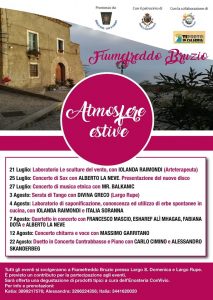 Nella cornice suggestiva del borgo tra i più belli d’Italia, è in via di svolgimento della seconda edizione di “Atmosfere Estive”, rassegna di concerti e laboratori di arti-terapie organizzato dalla cooperativa Borgo di Fiume, in collaborazione con la Pro Loco, l’associazione culturale Ti porto in Calabria, e il patrocinio del comune di Fiumefreddo Bruzio.
