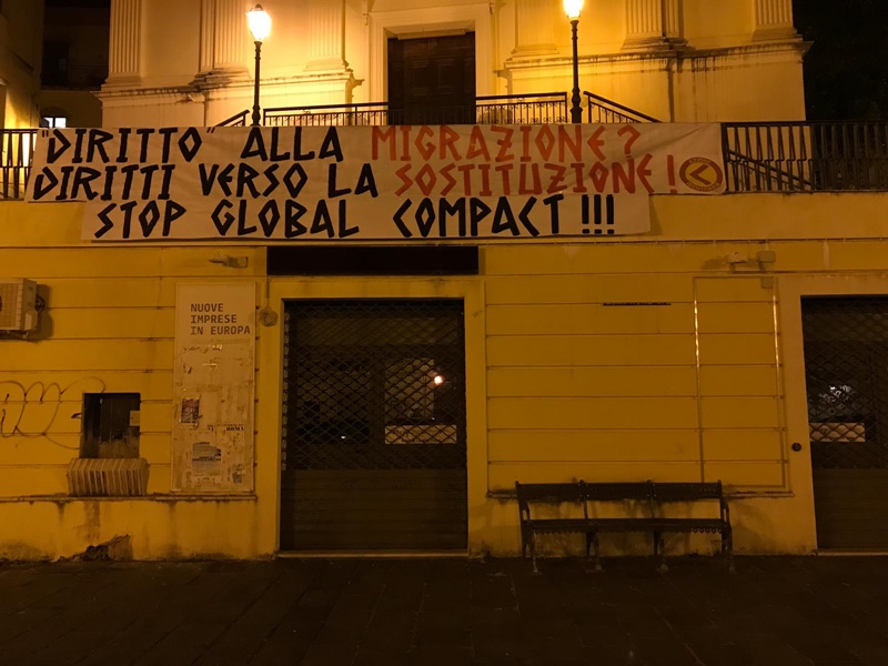 Con questo gesto, primo atto di una campagna di azioni e di informazione su scala nazionale, abbiamo voluto esprimere la nostra totale contrarietà alla ratifica del Global Compact for Migration (Patto Onu per le Migrazioni, GCM), da parte del Governo italiano.