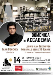 Dopo il successo del primo appuntamento, torna all’Accademia Amici della Musica di Acri il pianista bulgaro Ivan Donchev, protagonista dell’integrale delle 32 Sonate per pianoforte di Ludwig van Beethoven. Il secondo concerto, dal titolo “Tra passato e presente”, si terrà domenica 14 settembre 2025, alle ore 18:30, presso la sala concerti dell’Accademia.