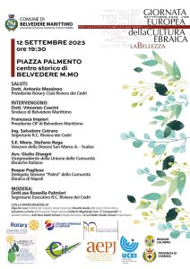 Questo straordinario evento, promosso e organizzato dal Rotary Club ‘Riviera dei Cedri’ Scalea, in stretta collaborazione con il Comune di Belvedere Marittimo e il CIF sezione locale, gode del prestigio dei patrocini di istituzioni di spicco, tra cui l’Ucei (Unione delle Comunità Ebraiche Italiane), l’Aepj (Associazione Europea per la Preservazione del Patrimonio Ebraico), la Comunità Ebraica di Napoli, e l’Archivio di Stato di Cosenza, oltre al sostegno della Regione Calabria e della Provincia di Cosenza.