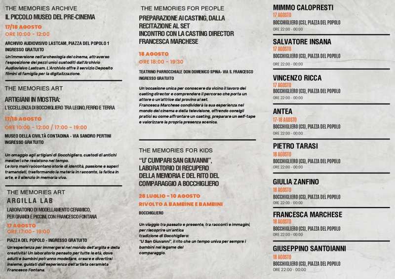 Si parte domenica 17 agosto con un omaggio agli artigiani di Bocchigliero, custodi di antichi mestieri che resistono nel tempo. All’interno del Museo della Civiltà Contadina, in via Sandro Pertini, dalle 10.00 alle 12.00 e dalle 17.00 alle 19.00, sarà possibile visitare una mostra dedicata alle loro creazioni, fatta di materia, anima e identità. Come nel cinema, anche nell’artigianato si intrecciano narrazioni, mani sapienti e amore per il dettaglio. Alle 17.00, in piazza del Popolo, protagonista della sezione The Memories Art sarà Francesco Fontana, artista e ceramista che da anni esplora il legame tra materia, tempo e narrazione visiva. Condurrà un laboratorio di modellamento ceramico aperto a grandi e piccini: un’esperienza per immergersi nel mondo dell’argilla e della creatività. Alle 22, in piazza del Popolo, prenderà il via la prima serata evento del Festival, condotta dalla giornalista Rai Gabriella d’Atri. Ospite d’eccezione sarà il regista, sceneggiatore, documentarista, produttore e attore cinematografico, Mimmo Calopresti. In occasione della sua partecipazione al Festival, sarà proiettato “Cutro, Calabria, Italia”, il film documentario vincitore del Nastro d’Argento 2025, che racconta la tragedia del 26 febbraio 2023, quando un vecchio caicco di legno, con 180 migranti a bordo, è naufragato a Steccato di Cutro. La serata evento vedrà inoltre la partecipazione della cantautrice Antea, del regista calabrese Salvatore Insana e del compositore, autore e produttore Vincenzo Ricca. Il regista, autore e produttore bocchiglierese Pino Iannelli farà rivivere le pellicole del cinema degli albori, frammenti d’archivio che documentano il Rito del Maio. Sarà inoltre proiettato il cortometraggio “U’ compare San Giovanni” di Pino, Caterina e Domenico Iannelli, realizzato nel corso del laboratorio “The Memories for Kids”, tenutosi dal 28 luglio al 10 agosto. Un viaggio tra passato e presente, tra racconti e immagini, per riscoprire “U San Giuvanni”, il rito che un tempo univa per sempre i bambini nel legame del comparaggio. I piccoli partecipanti hanno intervistato nonni e anziani del paese per ricostruire i gesti, le parole e il senso profondo di questo rito antico. Successivamente, hanno dato vita a un cortometraggio con il supporto della famiglia Iannelli, fondatrice dell’archivio audiovisivo Lastcam, dichiarato di interesse storico particolarmente importante dalla direzione generale archivi del Ministero della Cultura. All’interno della sede Lastcam, in piazza del Popolo, sarà possibile visitare il “Museo del pre-cinema”, dove saranno esposti lanterne magiche, zootropi, visori ottici e rari strumenti che hanno preceduto la nascita della settima arte.