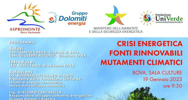 Giovedì 19 Gennaio, a partire dalle ore 9:30, alla presenza dell’ex ministro Pecoraro Scanio, a Bova si terrà l’iniziativa del Parco Nazionale dell’Aspromonte in collaborazione con UniVerde e Gruppo Dolomiti Energia, mirata a far riflettere e sensibilizzare i cittadini sulla crisi energetica, i cambiamenti climatici e le fonti rinnovabili