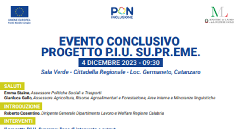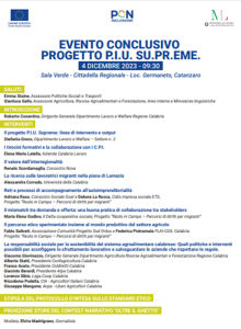 L’ “Evento conclusivo del progetto P.I.U. SU.PR.EME”, organizzato dalla regione Calabria chiude il percorso di diciotto mesi di “Resto in Campo – Percorsi di diritti per migranti”che si inserisce nel Progetto interregionale P.I.U Su.pre.me, realizzato con il cofinanziamento dell’Unione europea, PON Inclusione – Fondo Sociale Europeo 2014-2020 e inserito nell’ambito del Piano Triennale di contrasto allo sfruttamento lavorativo in agricoltura e al caporalato. L’ente capofila del progetto è stata la Regione Puglia in partenariato con la Regione Calabria, che ha affidato il coordinamento del degli enti no-profit all’Associazione Comunità Progetto Sud Onlus.