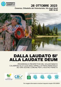 Dalla Laudato Sì alla Laudate Deum, progresso e prospettive del volontariato calabrese alla luce degli appelli di Papa Francesco finalizzata ad un’azione comune per il nostro pianeta. Questa la tematica dell’incontro che si terrà sabato 28 ottobre alle 16:30, alla Cittadella del Volontariato di via degli Stadi a Cosenza.